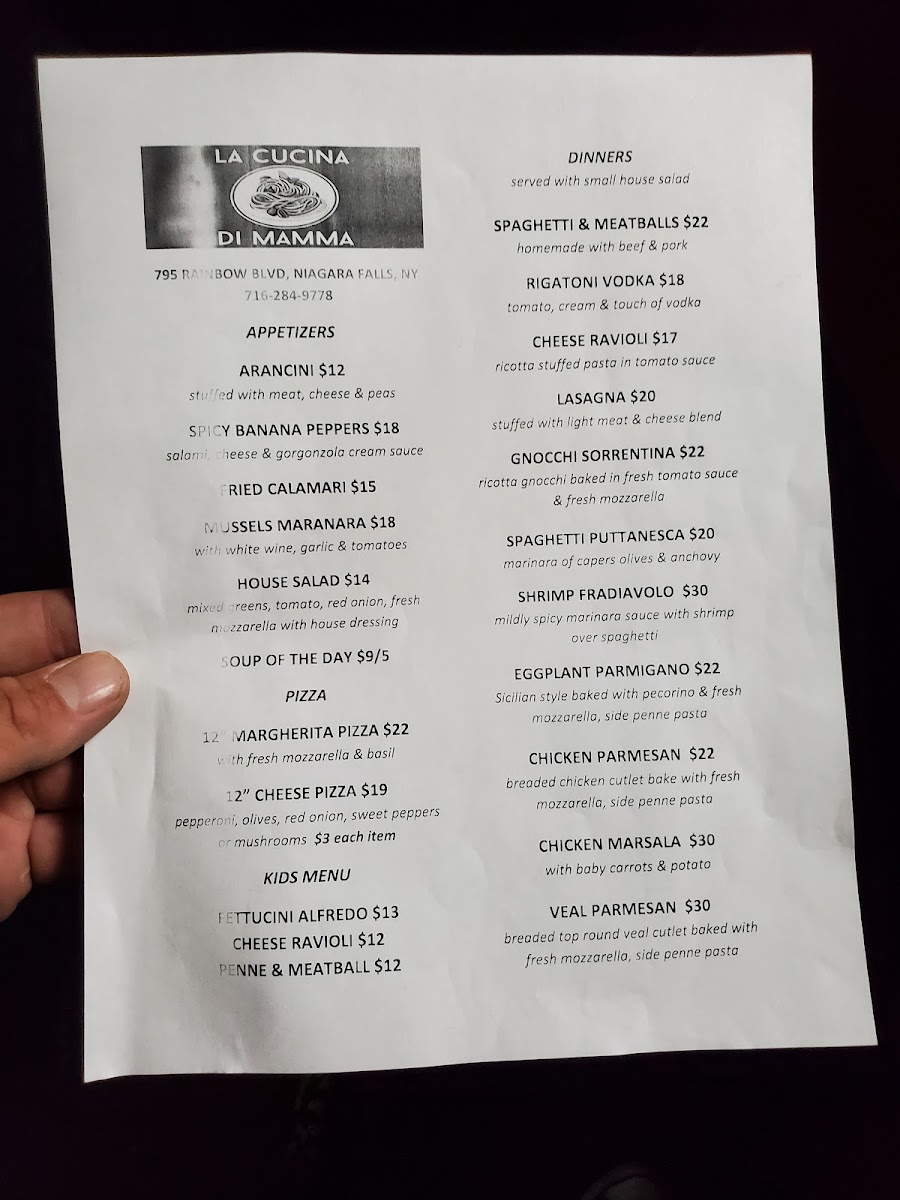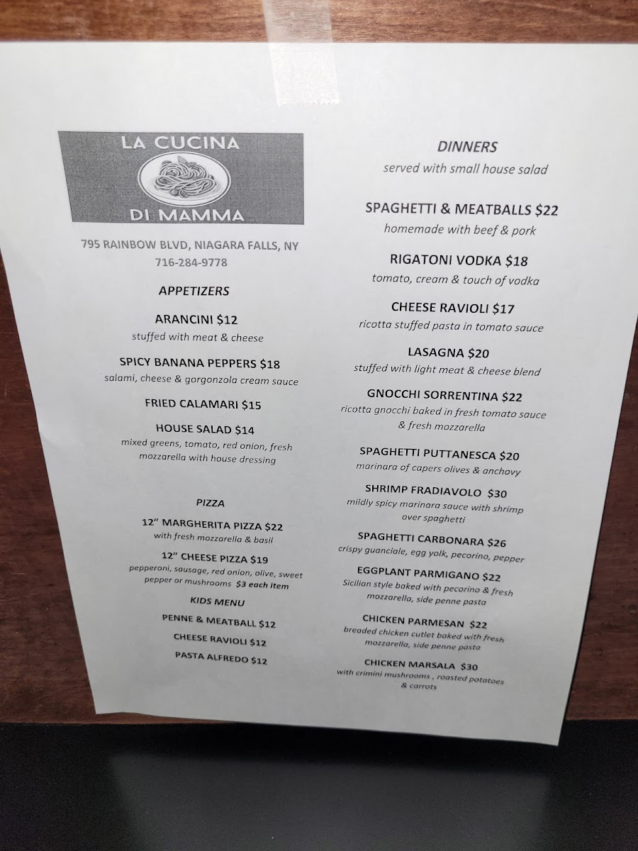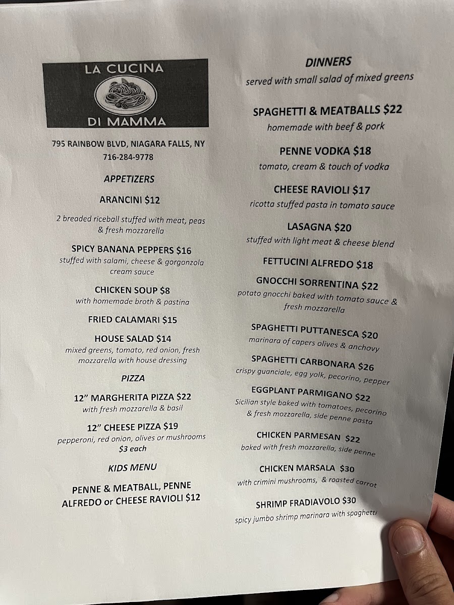 La Cucina Di Mamma, where each dish is a home-cooked celebration of traditional Italian flavors! Nestled at 795 Rainbow Blvd #1313 in Niagara Falls, NY, our menu boasts a delectable array of specialties that are sure to tantalize your taste buds. Start with our crispy Arancini or savory Bruschetta before diving into classic favorites like our rich Lasagna and hearty Spaghetti and Meatballs. For seafood lovers, the Shrimp Fradiavolo and Linguini with White Clam Sauce are must-tries! Don't forget to save room for a sweet Mini Cannoli to end your meal on a delightful note. Complement your dining experience with a refreshing Budweiser or one of our house-made salads. At La Cucina Di Mamma, there’s something for everyone, so come in and savor the flavors that feel just like home!